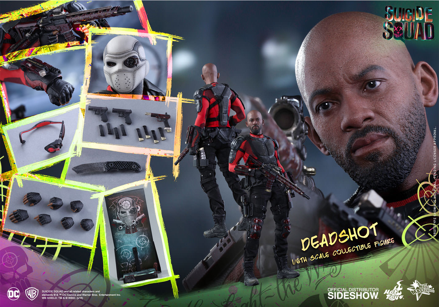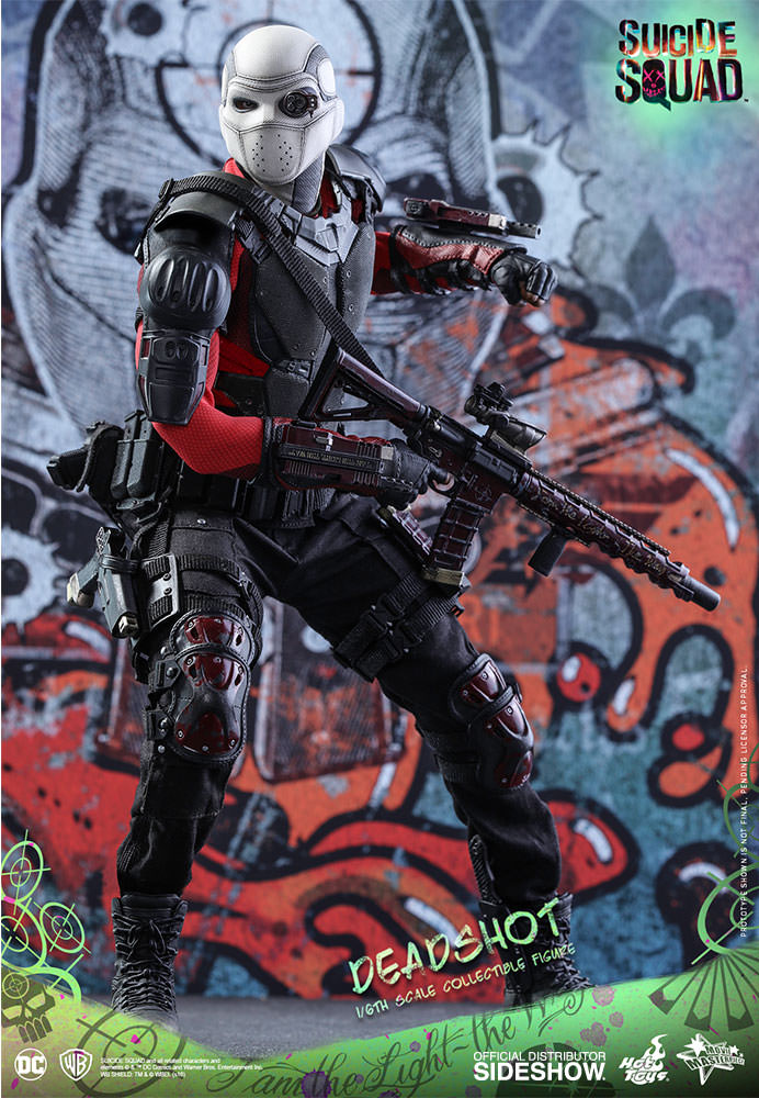 Figura articulada de Deadshoot, de la película ´Escuadrón Suicida´, interpretado por Will Smith en escala 1/6, tamaño aprox. 30 cm. Viene con ropa de tela y varios accesorios como una cabeza intercambiable con máscara y visor, 7 manos extra intercambiables, botas, cinturón, varios y un cuchillo. Peana y soporte con el logo de la película.
